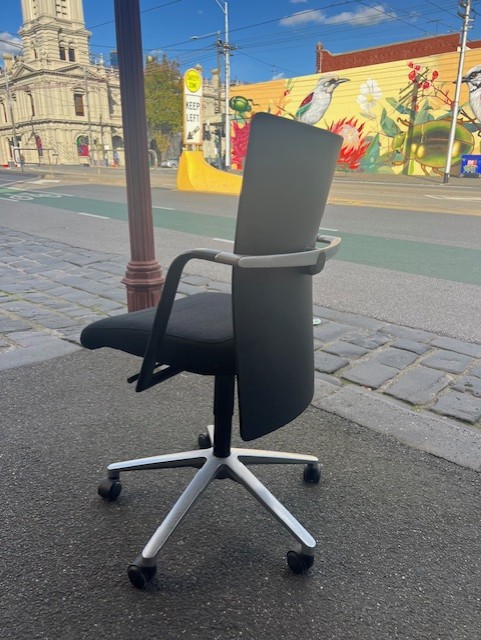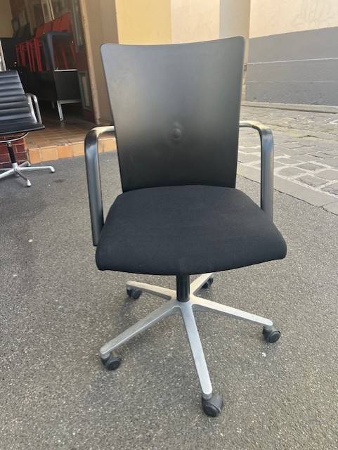 This version is upholstered in black fabric, offering a soft, breathable alternative to the more common leather versions, while maintaining the chair’s distinctive contrast with its polished steel frame.